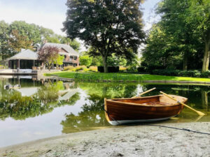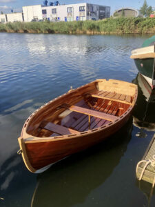 Klassiek gelijnde overnaadse roei jol, gebouwd in opdracht van een architectenbureau.